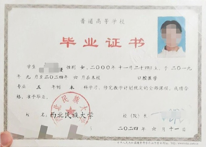 西北民族大学2024年普通全日制本科毕业证书样本图片(口腔医学)