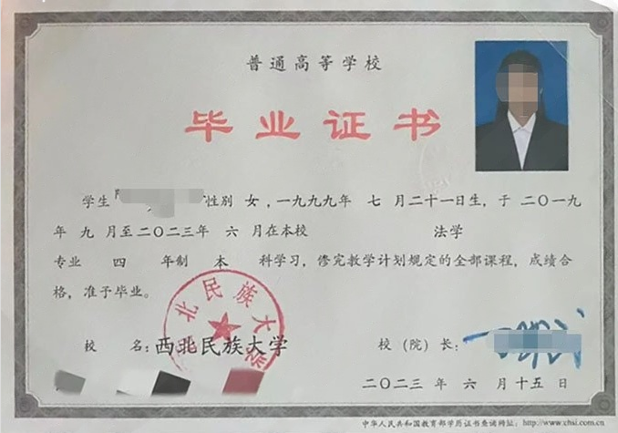 西北民族大学2023年普通全日制本科毕业证书样本图片(法学)